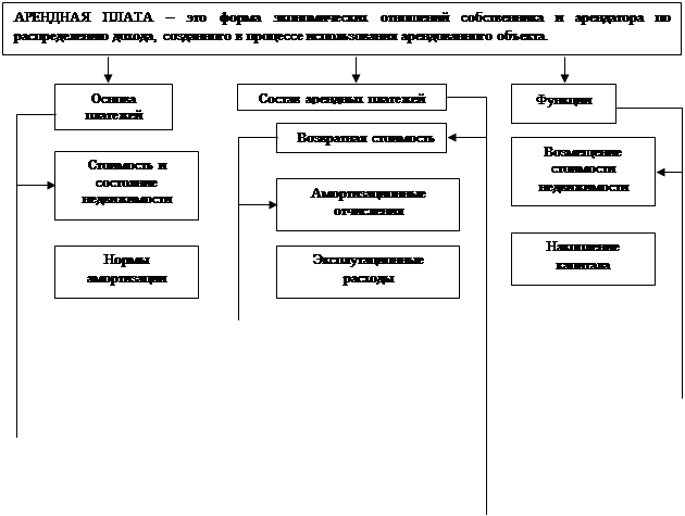 Арендная плата – это форма экономических отношений равноправных партнеров (собственника и арендатора) по распределению вновь созданной стоимости в процессе использования арендованного имущества. Она выполняет функции возмещения стоимости объекта недвижимости, накопления, стимулирования трудовой активности, перераспределения доходов и выступает одной из экономических форм реализации права собственности (см.схему № 9).