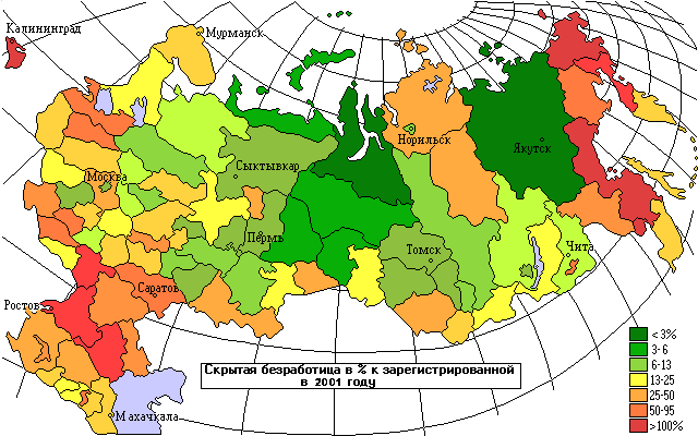 Обратное соотношение при высокой безработице характерно для лишенных интеллектоемкой промышленности Калмыкии, Дагестана, Осетии, Ивановской, Псковской, Астраханской и Курганской областей, а также Коми-Пермяцкого округа. При этом в Калмыкии, Курганской области и Коми-Пермяцком округе существует и наиболее высокая скрытая безработица.
