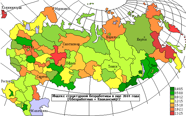 В соответствии с методикой МОТ, которой придерживается Госкомстат РФ, в марте 2001 года в России было 6,7 млн. безработных. По регионам зарегистрированная безработица (1,1 млн. чел.) распределяется неравномерно.