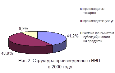 Прирост физического объема ВВП в 2000 году составил, по оценке Минэкономразвития, 7.6%. Номинальный объем ВВП (в текущих рыночных ценах) достиг 6940 млрд. руб., при индексе-дефляторе 141.5%. Дефлятор ВВП в течение всего года значительно превосходил индекс потребительских цен, такой разрыв объясняется резким повышением цен на экспортную составляющую ВВП и более высоким индексом цен на инвестиции.