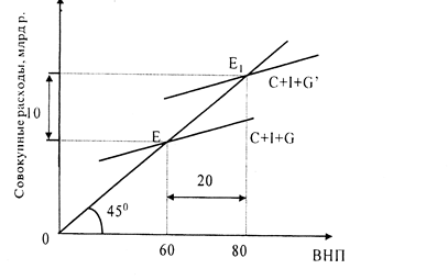 Покажем суть этого мультэффекта. Предположим, что при данном уровне потребления, инвестиций и государственных расходов равновесное состояние макроэкономики достигается в точке Е при объеме ВНП, равном 60 млрд. р.