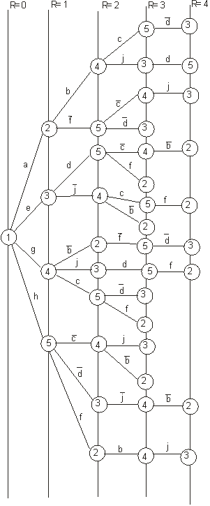 Как видим, в дереве есть четыре пути первого ранга (R = 1): a, e, g, h; десять путей второго ранга (R = 2): ab,