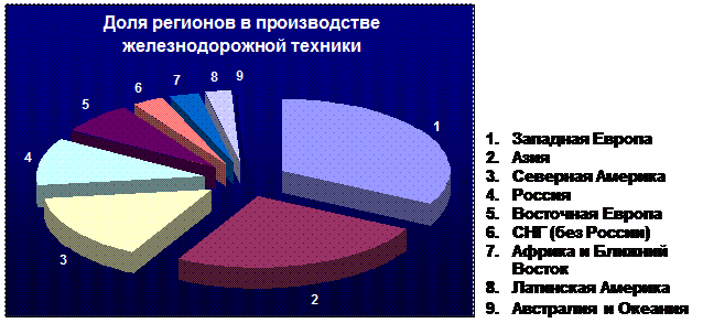 География судостроение и производства подвижного состава железных дорог испытала значительные изменения. Доли регионов в производстве железнодорожной техники показаны на таблице 2 (по материалам БИКИ ВНИКИ).