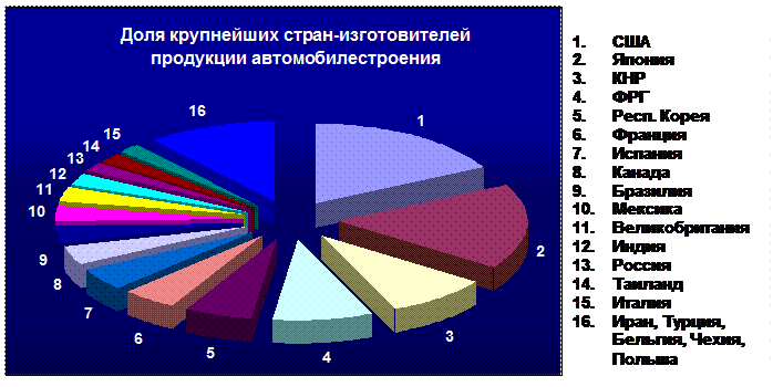 На сегодняшний день автомобилестроение в развивающихся странах сильно продвинулось в своем развитии. Лидеры по производству автомобилей из числа развивающихся стран – Китай, Бразилия, Индия, Мексика, Россия, Таиланд, Чехия и Южная Африка. Отношение долей крупнейших стран-изготовителей продукции автомобилестроения по данным 2006 года представлено на таблице 3 (по материалам БИКИ ВНИКИ).