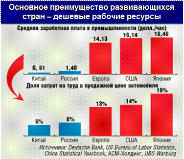 Вывод производственных процессов в развивающиеся страны.Главным конкурентным преимуществом развивающихся стран являются дешевые ресурсы (таблица 5). Например, цена легкового автомобиля, произведенного в Индии и доставленного в Японию, будет составлять 77-78% от его продажной цены в случае производства в Японии (источник – McKinsey Quarterly). Кроме того, производители автомобилей выносят в другие страны инжиниринг автомобилей и процессы НИОКР.