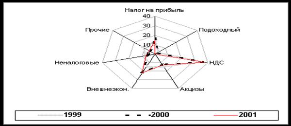 Структура доходов федерального бюджета в 1999-2001 гг. (январь-сентябре) (в % к общей сумме доходов)