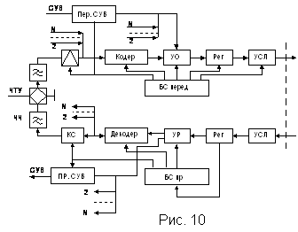 В приемной части системы сигнал преобразуется в обратной последовательности. Входные импульсы с линии после регенерации поступают на устройство разделения УР, где выделяются сигналы СУВ и информационные. Декодер служит для цифро-аналогового преобразования, в результате которого ИКМ сигнал превращается в АИМ сигнал. Разделение каналов осуществляется канальным селектором КС, а выделений первичного сигнала – ФНЧ.