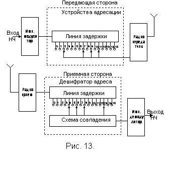 2 . Выходные сигналы, в частности речевые, подаются на входы импульсных модуляторов, где преобразуются в АИМ колебания, причем тактовые моменты дискретизации разных сигналов не совпадают, поскольку станции всех абонентов автономны и не синхронизированы. Модулированные импульсы поступают в устройство адресации, где каждый из них наделяется адресом. Адресом может быть, например, кодовая группа символов. В этом случае, устройство адресации представляет собой линию задержки (ЛЗ) с отводами. Каждому импульсу на входе ЛЗ соответствует группа импульсов на ее выходе. Число импульсов в группе зависит от числа используемых отводов лини. На рис.13, задействованы 4 отвода.