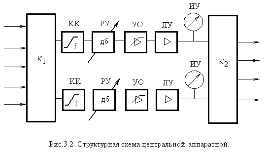 Координирующим центром радиодома является центральная аппаратная, задачами которой являются дополнительное регулирование сигналов, коммутация программ, поступающих из аппаратных, распределение их по потребителям, контроль входящих и исходящих программ. Упрощенная структурная схема центральной аппаратной приведена на рис.3.2.