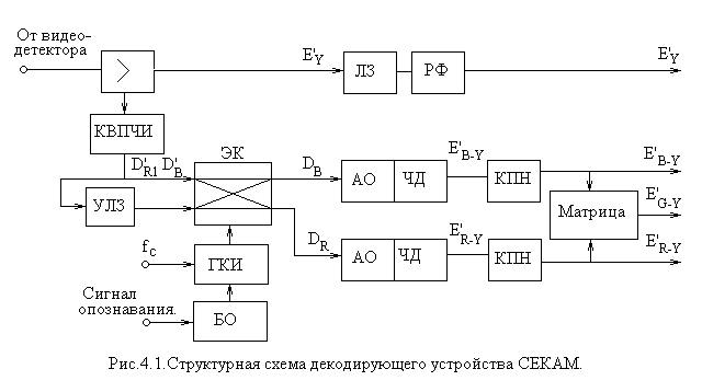 В приемном устройстве (рис. 4.1) полный сигнал Еп после видео усилителя разделяется на два канала: яркостный и цветовой информации. Сигнал Е'у проходит через линию задержки ЛЗ, и режекторный фильтр РФ, подавляющий в сигнале яркости частотно-модулированный сигнал цветности.