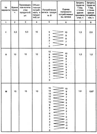 Обратим внимание на графы 7 и 8. В грифе 7, как уже отмечалось, выражены затраты на единицу продукта В с точки зрения производства. Они составляют один час, как в рассматриваемом первом варианте, так и в остальных двух. Однако почему следует смотреть на затраты труда только с точки зрения производства продукта? Ведь существует правило, что продукт есть процесс и производства, и потребления. Значит, надо анализировать затраты труда также со стороны потребления. Объективно работнику надо 10 единиц В в день. Значит, для удовлетворения потребностей при сложившейся производительности — единица В в час— опять же объективно, работник должен затратить на производство 10 В десять часов труда. Затратил он только пять (графа 2).