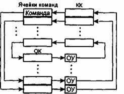 Результат выполнения команды над ее непосредственно адресуемыми операндами направляется через командный коммутатор (КК) согласно указанным в команде адресам в ячейки команд и помещается в поля операндов. Далее указанная процедура циклически повторяется, причем управление этим процессом полностью децентрализовано и не нуждается в счетчике команд.