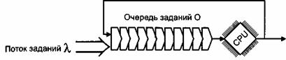 Заявки на выполнение работ поступают с интенсивностью λ в очередь О, откуда они выбираются и исполняются процессором CPU. Для обслуживания отдельной заявки отводится постоянный квант времени q, достаточный для выполнения нескольких тысяч операций. Если работа была выполнена за время q, она покидает систему. В противном случае она вновь поступает в конец очереди и ожидает предоставления ей очередного кванта процессорного времени.