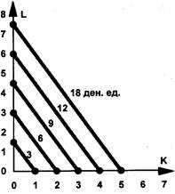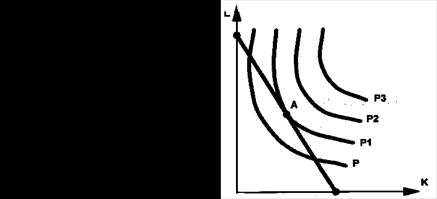 Если данная комбинация применяемых факторов (3L и 2K) минимизирует издержки при заданном объёме производства при данной сумме издержек. Из рис. 8 видно, что для максимизации объёма выпуска фирма применяет комбинацию факторов, соответствующую точке А. Фирма не в состоянии осуществлять объём выпуска, соответствующий изокванте Р2, а тем более Р3, ибо последние ни в одной точке не соприкасаются с изокостой. Для перехода на более высокие изокванты фирме необходимы дополнительные производственные факторы (труд и капитал).