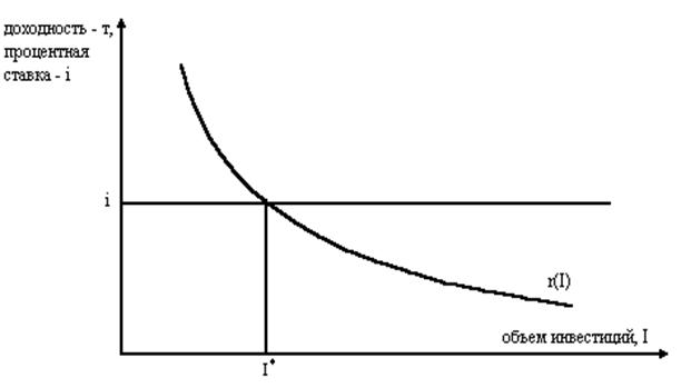 Оптимальный объем инвестиций I* определяется равенством доходности инвестиций r и рыночной процентной ставки i. Тем самым кривая предельной эффективности инвестиций представляет собой кривую инвестиционного спроса фирмы.