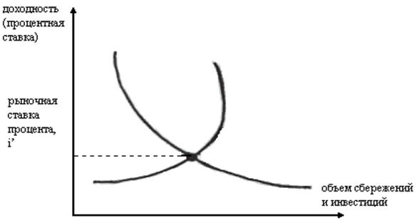 Взаимодействие спроса и предложения на любом конкурентном рынке определяет равновесные значения объемов и цен. Под конкурентным рынком (рынком совершенной конкуренции) мы понимаем рынок, на котором ни один из участников не имеет возможности оказывать влияние на цену. Есть все основания считать рынок заемных средств в значительной степени конкурентным – на нем присутствуют предприятия всех отраслей и видов деятельности, и практически все домашние хозяйства. Если даже очень большая фирма изменит свои решения относительно инвестиций – в масштабах всей экономики это не окажет существенного влияния на процентную ставку. Таким образом, в нашей модели объем инвестиций и рыночная процентная ставка (плата за использование заемных средств) определяется, исходя из равновесия спроса и предложения. Механизм здесь аналогичен любому другому конкурентному рынку – дефицит (предложение спроса над предложением) приводит к увеличению цены, излишек – к снижению. По словам Джона Стюарта Милля: “Ставка процента должна быть такой, чтобы спрос на ссудные капиталы уравнялся с их предложением. Она должна быть такой, чтобы количество капитала, которое одни люди желают отдать взаймы под конкретный процент, было равно тому количеству капитала, которое другие хотят взять взаймы”.