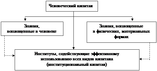 3. Институциональный капитал состоит из живого и неживого капитала, связанного с производством услуг, удовлетворяющих коллективные нужды общества. Он включает в себя все правительственные и неправительственные институты, которые содействуют эффективному использованию двух типов капитала (образовательные и финансовые учреждения).(См.: Рисунок 1).