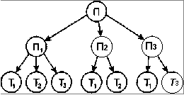 На верхнем, первом уровне находится информация об объекте "поставщики" (П), на втором — о конкретных поставщиках П1, П2 и П3, на нижнем, третьем, уровне — о товарах, которые могут поставлять конкретные поставщики.