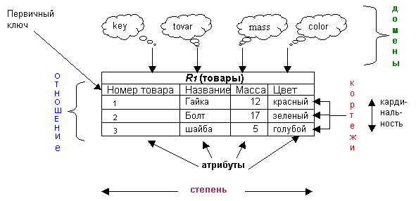 Значение n— число атрибутов в отношении — называется степенью отношения. Отношение степени один называется унарным, степени два — бинарным, степени три — тернарным, степени n n-арным. В приведенной базе данных таблиц R1, R2 и R3 степень отношений R1 и, R2 равна четырем, а отношения R3— трем. Число кортежей в отношении называется кардинальный числом этого отношения. Кардинальные числа отношений R1, R2 и R3 равны соответственно 3, 3 и 7. Кардинальное число отношения изменяется во времени (кортеж может быть добавлен или удален) в отличие от его степени.