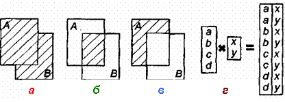 а - объединение; б - пересечение; в - разность г - декартово произведение