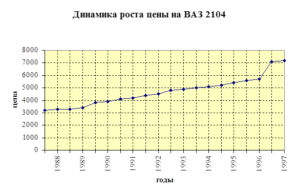 В данной диаграмме, которая представляет собой график приведена средняя цена на ВАЗ 2104 в зависимости от года выпуска. По оси абсцисс отложены годы выпуска автомобиля, по оси ординат - цена.
