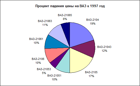 В диаграмме показан средний процент падения цены на автомобили ВАЗ с 1988 года выпуска по 1997 год. Для построения использовалась информация, находящаяся в таблице № 2 « Процент падения цены на автомобили по годам ». Формулу для вычисления процента падения см. в разделе «Формулы». Далее находится среднее значение, и по этим данным строим диаграмму.