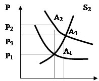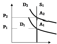 Допустим, что в мгновенном периоде резко повышается спрос. Так как предложение не может в эти же сроки отреагировать на повышении спроса, на рынке произойдет резкое повышение цены – с P1 до P2. Предложение будет характеризоваться вертикальной линией, показывающей его абсолютную неэластичность.