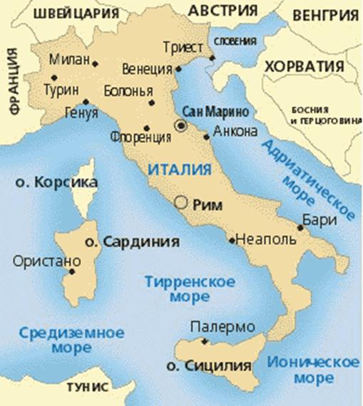 Италия – типичная средиземноморская страна, расположенная в центральной части Южной Европы. Ее территория включает Паданскую низменность, обращенные к ней склоны Альпийской горной дуги, Апеннинский полуостров, крупные острова Сицилия и Сардиния и многочисленные мелкие острова (Эгадские, Липарские, Понцианские, Тосканский архипелаг и др.). На севере, в материковой части, Италия граничит с Францией, Швейцарией, Австрией и Югославией. На юге она через Тунисский пролив соседствует с Африкой. Апеннинский полуостров глубоко вдается в Средиземное море. Берега Италии омываются морями: на западе –Лигурийским и Тирренским, на юге – Ионическим, на востоке – Адриатическим. Площадь Италии 301,230 тыс. кв. км. Столица – Рим. Крупнейшие города – Милан, Неаполь, Турин, Генуя и др. В пределах Италии находятся два государства – Ватикан и Сан-Марино, окруженные со всех сторон её территорией. Административно-территориальное деление – 20 областей.