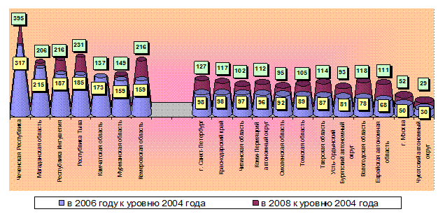 К 2008 году темпы роста объемов инвестиций возрастут во всех субъектах Российской Федерации. Лидерами будут Чеченская Республика и Республика Тыва. Замедлится рост инвестиций в Камчатскую область (до 137% в 2008 году к уровню 2004 года) вследствие прогнозируемого завершения работ по строительству газопровода в г. Петропавловск-Камчатский.