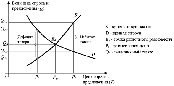 Изобразим путем совмещения на одном графике кривые спроса D и предложения S на определенный товар; при этом будем иметь в виду рыночный спрос и рыночное предложение, то есть спрос и предложение всех участников рынка на данный товар.