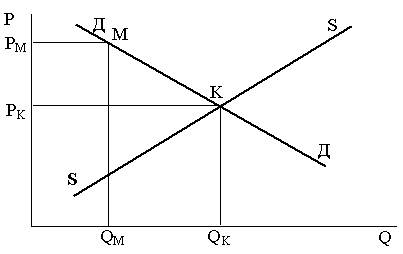 Графически рыночное равновесие определяется точкой пересечения кривых спроса Д-Д и предложенияS-S. В условиях свободной конкуренции рыночная (равновесная) цена является конкурентной. Свободная конкуренция предполагает такое (достаточно) большое количество продавцов и покупателей, чтобы ни один из них не мог оказать существенное влияние на уровень рыночной цены. Важно отметить, что кривые спроса Д-Д и предложенияS-S складываются соответственно из кривых спроса и кривых предложения отдельных хозяйствующих субъектов. При монополизации рынка ситуация существенно изменяется.