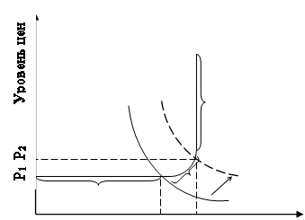 Увеличение денежной массы по указанным выше причинам в течении короткого промежутка времени сдвигает кривую совокупного спроса вправо (АD1 ® AD2), и если экономика находится на промежуточном (2) или классическом (3) отрезках кривой совокупного предложения, то это ведет к росту цен, что представляет инфляцию спроса [6, c. 428].