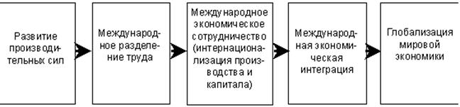 На современном этапе происходят глубокие изменения во всей системе международных отношений. Существенной их чертой становится глобализация. Схематично процессы, ведущие к экономической интеграции и глобализации, можно выразить взаимосвязанной цепочкой, представленной на рис. 1. Этапы, отраженные на рисунке, безусловно, несколько упрощенно характеризуют процесс интернационализации мировой экономики. В реальной действительности очень сложно выделить эти этапы в чистом виде, можно выявить только определенные тенденции, и существуют несомненно как прямые, так и обратные связи между ними. Так, например, говоря о глобализации как необратимом и объективном процессе, имеем ввиду именно тенденцию развития, причем не всегда прямолинейную, а с зигзагами на определенных отрезках времени и с обратным движением. Процесс идет скорее по спирали, на очередном витке достигая развития на более высоком уровне. Несколько абстрактная схема приводится с целью попытки разграничить понятия «интернационализация хозяйственной жизни», «международное экономическое сотрудничество», «международная экономическая интеграция», «глобализация» и отражает точку зрения автора данной статьи на исследуемый вопрос.