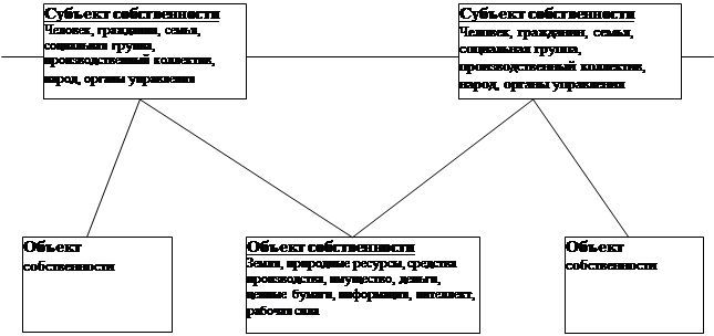 Рассмотрим более детально отношения “субъект собственности – объект собственности” и “субъект собственности – субъект собственности”, представляющие основные типы собственнических отношений. Общая схема таких отношений в их взаимосвязи изображена на рисунке.