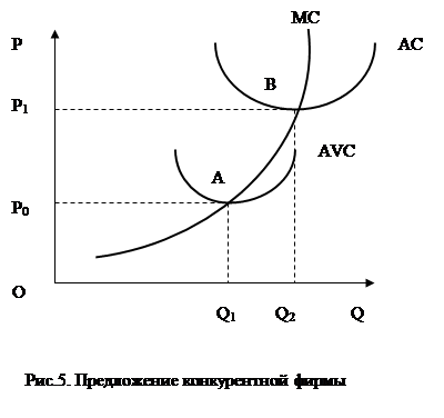 Если рыночная цена продукта меньше p1, то фирма прекращает производство, а ее предложение равно нулю. Если рыночная цена продукта лежит в пределах от p1 до p2, то фирма продолжает производство, но несет убытки. Если цена продукта больше p2, то фирма получает прибыль.