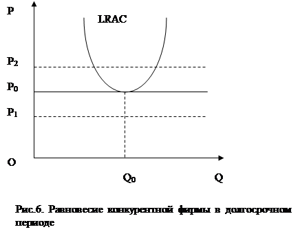 Покажем, что с течением времени на рынке совершенной конкуренции цена продукта тяготеет к минимальным долгосрочным средним издержкам (цена p0 на рис.6).