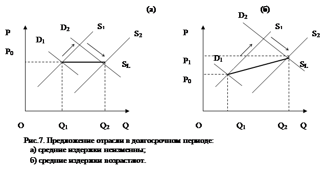 На рис.7(а) долгосрочная кривая предложения отрасли с неизменными издержками изображена жирной линией и обозначена SL. Через p0 обозначены минимальные долгосрочные средние издержки, через Q1 – отраслевой выпуск до увеличения рыночной цены, через Q2 – отраслевой выпуск после повышения рыночной цены.