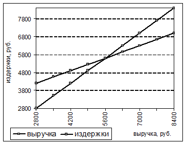 Фиксированные издержки (FC) составляют 2800 руб. (2000 + 800), переменные издержки (VC) – 50% от объёма услуг, который следует оплатить. Требуется оплатить минимальный объём выручки R, при котором покрываются все издержки.