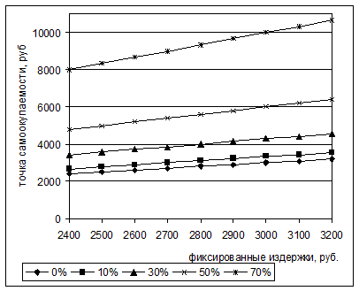 Пусть фиксированные издержки FC могут меняться от 2400 руб. до 3200 руб., а переменные издержки VC – от 0 до 70%. Проведём анализ точки безубыточности (по формуле 1.6). Результаты анализа сведены в таблице 4 и диаграмме 3.