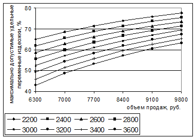 Зависимость максимально допустимых удельных переменных издержек от объёма продаж.