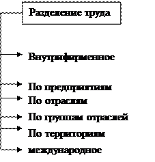 Принцип общественного разделения труда используется во всех хозяйственных звеньях, по-этому есть возможность выделить шесть основных уровней специализации. Так, --- внутрифирменное разделение труда предполагает его обособление в рамках каждого предприятия - по участкам, цехам, отделам, профессиям и так далее. Специализация ---- по предприятиям означает, что отдельные заводы и фабрики концентрируются на производстве определённой продукции (например, молочный комбинат, хлебозавод, мебельная или текстильная фабрика и др.).