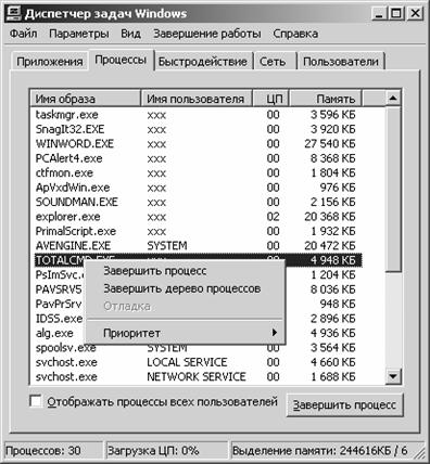 Таким образом, методы класса Win32_Process позволяют выполнять над процессами те же действия, которые можно осуществить в Диспетчере задач Windowsс помощью контекстного меню, появляющегося после щелчка правой кнопкой мыши над выделенным процессом в списке (рисунок 6.3), и кнопки «Завершить процесс»(Terminate process).