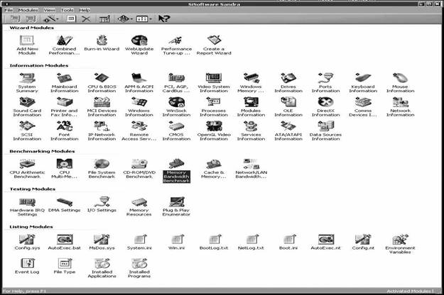 Известная утилита компании SiSoftware позволяет собирать всестороннюю информацию об аппаратном и программном обеспечении компьютера; тестировать производительность центрального процессора, оперативной и кэш памяти, файловой системы, CD-ROM и DVD приводов, сетевых соединений; просматривать листинги системных файлов, переменных среды, типы файлов, журналы событий, установленные приложения и устройства; поддерживается гибкая система построения отчетов (рисунок 4.1).