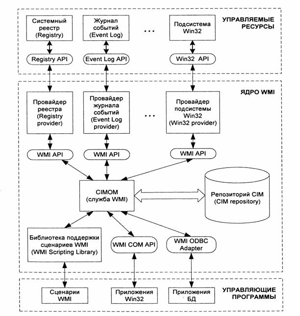 Ядро WMI(WMI infrastructure). Это связующее звено архитектуры WMI, отвечающее за связь управляющих программ с управляемыми объектами. Ядро WMI, в свою очередь, можно разделить на три части: менеджер объектов CIM (Common Information Model Object Manager, CIMOM), репозиторий (хранилище классов и объектов) CIM и провайдеры WMI. Кроме этого, для доступа к WMI с помощью сценариев необходима специальная библиотека поддержки сценариев WMI (WMI scripting library), которая располагается в файле wbemdisp.dll в каталоге %SystemRoot%\System32\ Wbem (в Windows Server 2003, Windows XP, Windows 2000 и Windows NT) или в каталоге %WinDir%\System\Wbem (в Windows Me и Windows 9x).