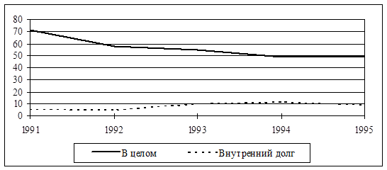 В последние 3-4 года были проведены крупные операции, оказавшие сильное влияние на уровень и структуру долга. Снижение внешнего долга, произошедшее в 1994г., было компенсировано новыми займами. По этой причине внешний долг продолжает оказывать стагнирующий эффект из-за отвлечения внутренних ресурсов на его обслуживание. Это ведет к серьезному ухудшению инвестиционного климата в стране.