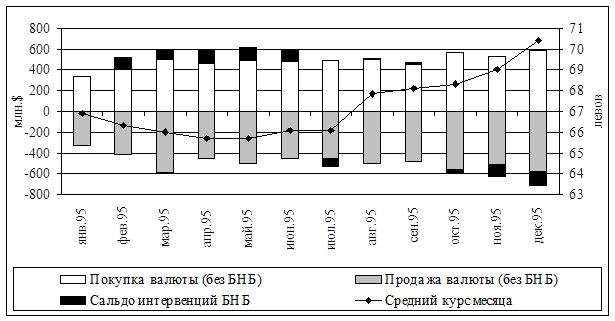 Несмотря на то, что в 1995г. БНБ накапливал резервы с оглядкой на обслуживание внешнего долга, немалая доля этого резерва была предназначена для поддержания своей политики на валютном рынке. Это особенно заметно в конце года, когда БНБ был вынужден активно реализовывать твердую валюту, чтобы не допустить резкого обесценивания лева (см.рис.1-3).