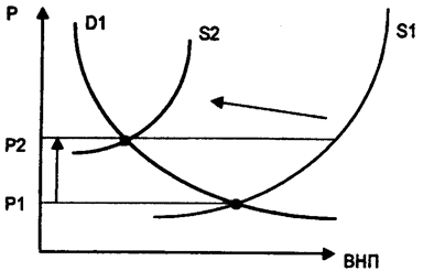 Как видно из графика, повышение цены предложения (рост издержек) приводит к смещению кривой предложения вертикально вверх. В итоге, через определенное время баланс спроса и предложения вновь налаживается, но уже в точке, соответствующей более высокой цене.