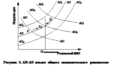 4. Объем реального национального продукта (стоимость продукта в неизменных ценах) и темп инфляции, обеспечивающие равенство между совокупным спросом и предложением, обычно называют состоянием общего макроэкономического равновесия (сбалансированности) экономики. Это важнейшая составляющая народнохозяйственной сбалансированности. На рис. 5 заданы кривые совокупного спроса AD и предложения AS и точка Е, фиксирующая состояние общего экономического равновесия («крест Кейнса»).