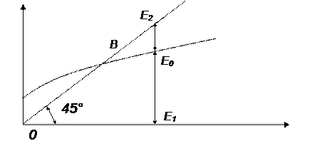 Построим график, отражающий предельную склонность к потреблению. На оси абсцисс откладывается чистый доход (после уплаты налогов). На оси ординат — расходы на потребление. Если бы расходы в точности соответствовали доходам, то это отражала бы любая точка, лежащая на прямой, проведенной под углом 45°. Но в действительности такого совпадения не происходит, и только часть доходов расходуется на потребление.