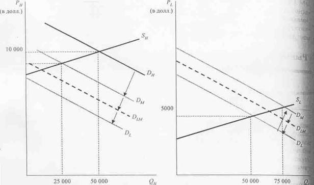 Предположим, что имеются два типа подержанных машин — высокого и низкого качества. Предположим также, что как продавцы, так и покупатели могут определить тип автомобиля. На рис. 1,а SH — кривая предложения высококачественных машин, a DH — кривая спроса на них. Аналогично, SL и DL на рис. 1,б — кривые предложения и спроса для низкокачественных автомобилей. Заметим, что SH, лежит выше, чем SL, поскольку собственники высококачественных автомобилей расстаются с ними менее охотно и должны получить при этом более высокую цену. Аналогично, DH расположена выше DL , так как покупатели готовы заплатить больше за хорошее качество. Как видно из рисунка, рыночная цена высококачественных машин — 10 000 долл., низкокачественных — 5000 долл., и при этом продаются 50 000 экземпляров каждого типа.